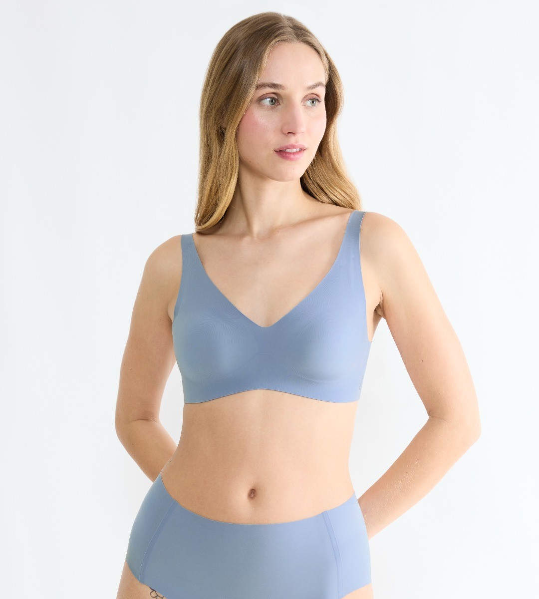 De Sloggi ZERO Feel 2.0 Soft Bra in Chambray combineert ultiem comfort met praktische ondersteuning dankzij de bh-sluiting aan de achterkant. Het zachte, rekbare materiaal voelt licht en soepel op de huid en sluit mooi aan, terwijl de naadloze afwerking drukpunten voorkomt. Perfect voor dagelijks gebruik en eenvoudig te combineren met de bijpassende hipster of high waist voor een complete set.